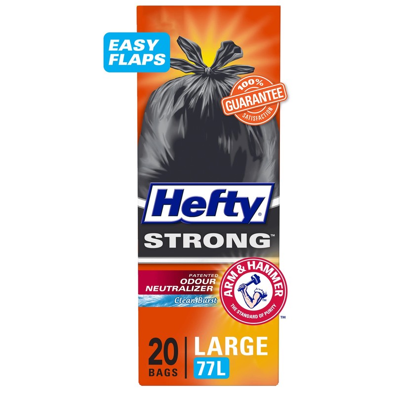 - Hefty Strong Garbage Bags, Regular, Black, with Arm & Hammer odour neutralizer, 77 Litres, 20 Count