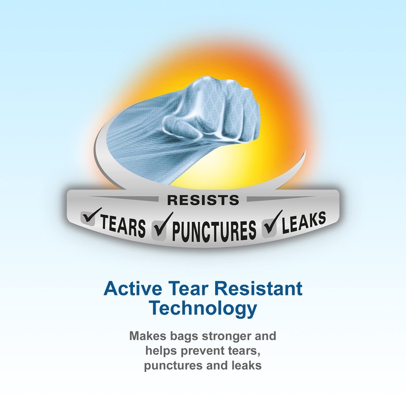 - ACTIVE TEAR RESISTANT TECHNOLOGY—Our strongest recycling bags are made with a flexible technology that helps prevent tears, punctures and leaks to keep waste where it belongs