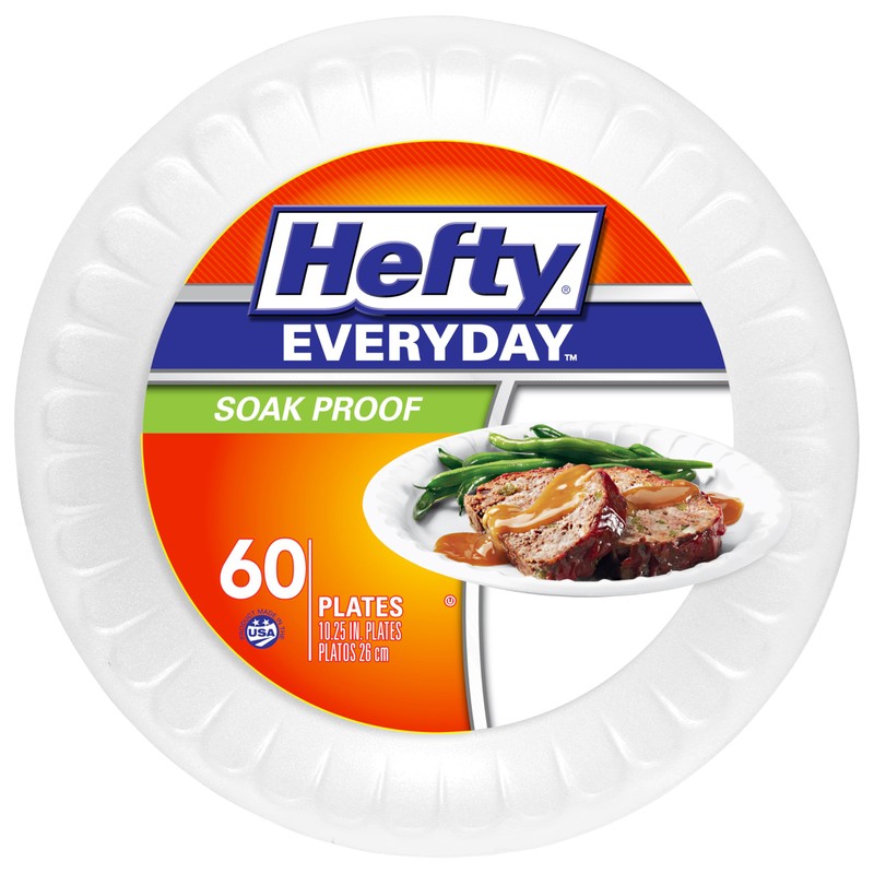 Use Hefty Everyday Soak-Proof Foam Plates for any kind of meal, including lasagna, barbeque, family meals and more. With a 10 inch size perfect for special occasions or everyday meals, these Hefty plates prevent messes while remaining affordable for everyday use. The durable foam construction of these white foam plates features a soak-proof layer that prevents leaks. Spend less time cleaning up and more time enjoying your gathering with these disposable plates. Don't forget; all Hefty foam dinnerware comes with a 100% satisfaction guarantee.