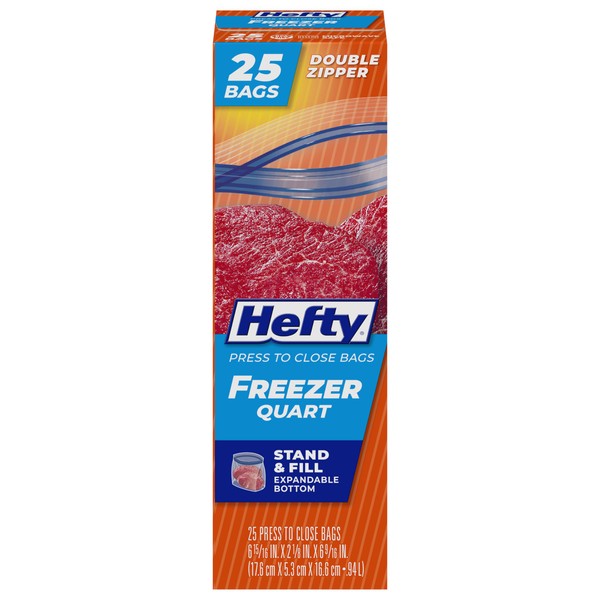 - Quart Size Plastic Freezer Bags: This pack includes 25 quart size, BPA-free, microwave-safe Hefty Press to Close Freezer Bags