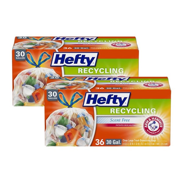 - This package contains 36 Hefty Recycling, clear, unscented, 30 gallon trash bags, each 0.7 mil thick