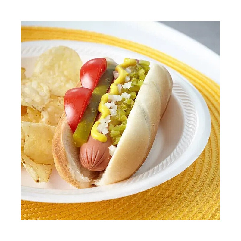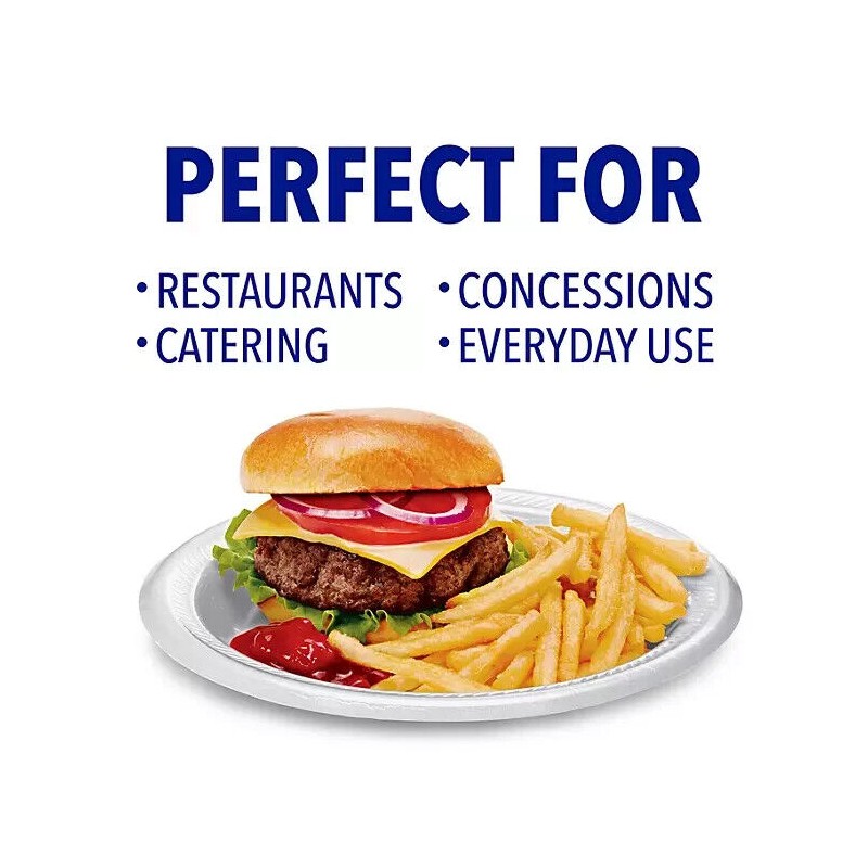 The product is a pack of 250 Hefty Supreme Foam Disposable Lunch Plates, each measuring 8 7/8 inches. These plates are designed for single-use convenience and are suitable for serving food at parties, gatherings, or other events where disposable tableware is needed. Made of foam material, they are lightweight yet sturdy enough to hold a variety of foods. Perfect for quick clean-up after meals, these plates offer a practical solution for serving lunch or snacks without the need for washing dishes.