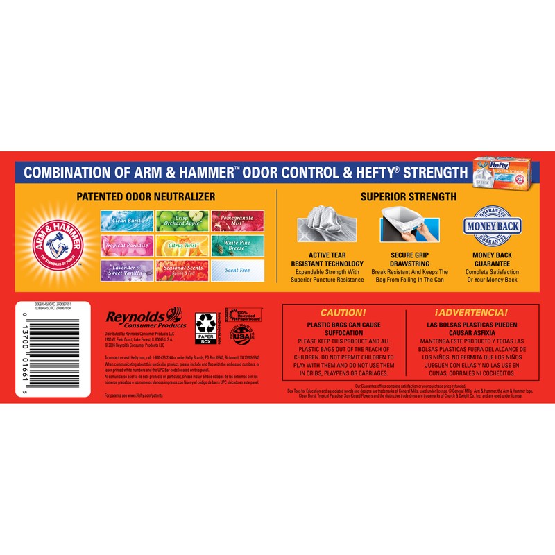 - Patented Arm & Hammer odor neutralizer fights nasty odors in trash bag to keep your kitchen smelling fresh