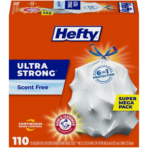 - This package contains 110 Hefty Ultra Strong, white, unscented, 13 gallon trash bags, each 0.9 mil thick
