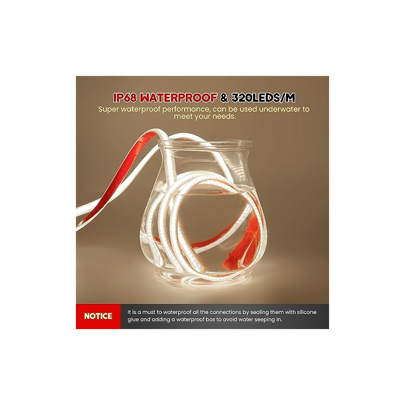- ?Wasserdicht IP68: Die ultrahellen LED-Streifen fr den Au?enbereich sind in einem hochwertigen Silikonschutzschlauch eingeschlossen, der eine hohe Wasserbest?ndigkeit und Alterungsbest?ndigkeit bietet. Sie wurde sowohl fr die Innen als auch fr die Au?enbeleuchtung entwickelt und h?lt starken Regenf?llen, Schneef?llen oder Spritzern stand.