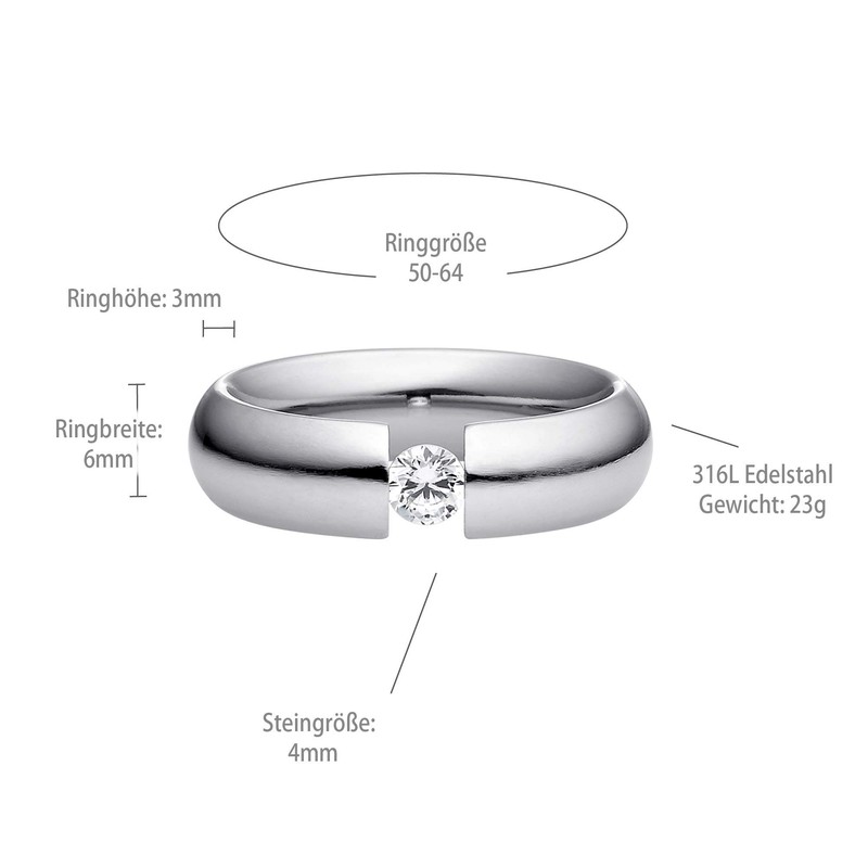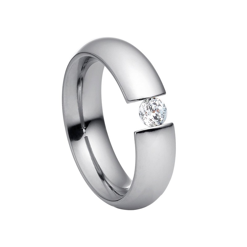 Tension rings are one of the newest jewellery classics. Special features: The ring band is open and the holds a sparkling stone mounted between the two ends. Unlike with set stones, the light can shine through this stone almost unhindered and the facets refract the light. It is this light refraction that makes a stone sparkle. Bright star in the stainless steel ring Intensio is a zirconia that has been cut to a brilliant cut. It has a diameter of 4 mm/0.15 inches and fits perfectly into the 6 mm/0.24 inches narrow ring band made of polished stainless steel. This eye-catching ring can also be used as an engagement or wedding ring and is made from skin-friendly, nickel-free surgical steel and can be worn by those with allergies. Available in a variety of stone colours.