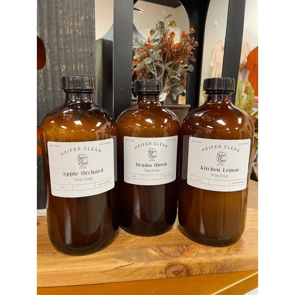 - HP’s Heifer Clean Mop SoapNon-Toxic Pet friendly (not to consume) Safe for all floor types! Dilute more if you need less scent! This is a Highly Scented Concentrated Formula, so add desired amount to very hot or boiling water depending on how strong the scent you want!!!Ingredients: Purified Water, Plant Based soap, Clean Fragrance Oils, & Certified Organic Oils16 oz Glass Jar with LidThis will get you about 14-16 uses depending on how big of an area you are mopping.Please shake well before each use.Boujee Heifer:A wealthy blend of amber musk, saffron and patchouli nuanced with a touch of lemon and jasmine.Drama Queen:Clean, ozone, fruity green top notes with jasmine, lily of the valley, mid notes of lavender, and woody, earthy, and musky bottom notes.High Standards:This scent has floral top notes, Followed by woodsy middle notes, rich sweet patchouli with exotic musky undertones.Volcano:This well-admired scent will captivate your senses with its sweet juicy core. Bursting with Raspberries, dragonfruit and pomegranate, the complexity of coconut water and simple sugar add an air of the exotic islands.Gracie:Green, citrusy, fresh top notes with floral middle notes of rose, jasmine & lily enhanced by long lasting woody, musky, earthy, amber & sweet cotton candy type bottom notesLavender Cotton: The perfect blend of lavender, chamomile, sandalwood with a touch of lemon and cotton blossom!!!Vanity- New scent! Which is a seductive blend of warm, woodsy Egyptian musk and enchanting patchouli spiced with the subtle sweetness of cinnamon, orange blossom, and hints of anise. Kitchen Lemon is a well balanced natural aroma suitable for any space . A botanical citrus blend with top notes of bright lemon .This fragrance oil is infused with all natural essential oils including orange , lemon peel, and lemongrass. Harvest SpiceTop Notes of sparkling citrus, cinnamon, and appleMid Notes Blush Rose, Clove, crushed greensBottom notes-Rasberry Jam, scarlet peach, sugared vanillaApple Orchard Captures the aroma and sensation of plucking a ripe apple from your own orchard . Green leaves , pear , and hints of cypress , smoke , and vanilla combine to transport you to the heart of an apple orchard .Vanity -Our newest scent! Which is a seductive blend of warm, woodsy Egyptian musk and enchanting patchouli spiced with the subtle sweetness of cinnamon, orange blossom, and hints of anise.Brazilian Daze-Take your senses to a five star beach resort. Capture the warmth of the sun and the rich scent of a tropical paradise with this luxurious fragrance . Top notes Pistachio with a hint of salted caramel and vanilla.Mahogany DriftUnique blend of Mahogany layered with hints of coconut, vanilla and oakmoss.