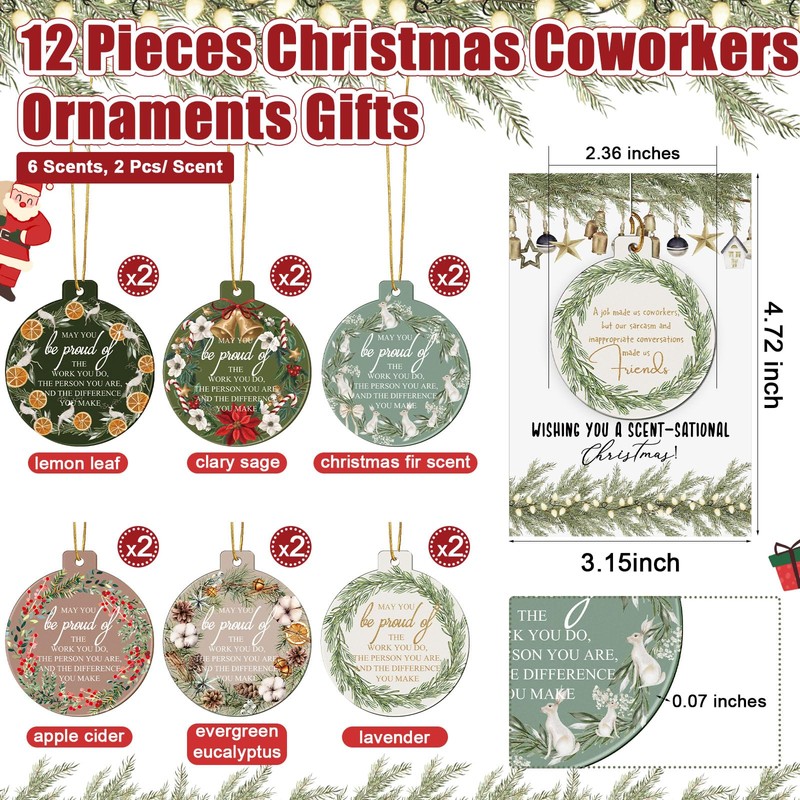- Christmas Scents Bulk: you will receive 12 pieces of Christmas scents ornaments for coworkers with 6 scents, equipped with gold strings, 12 pieces of paper cards and 12 pieces of clear plastic gift bags; Fresh scented pendants fill the air with the warmth and joy of Christmas
