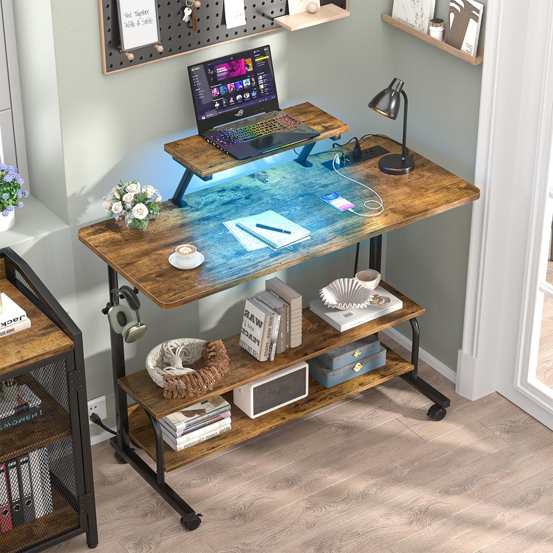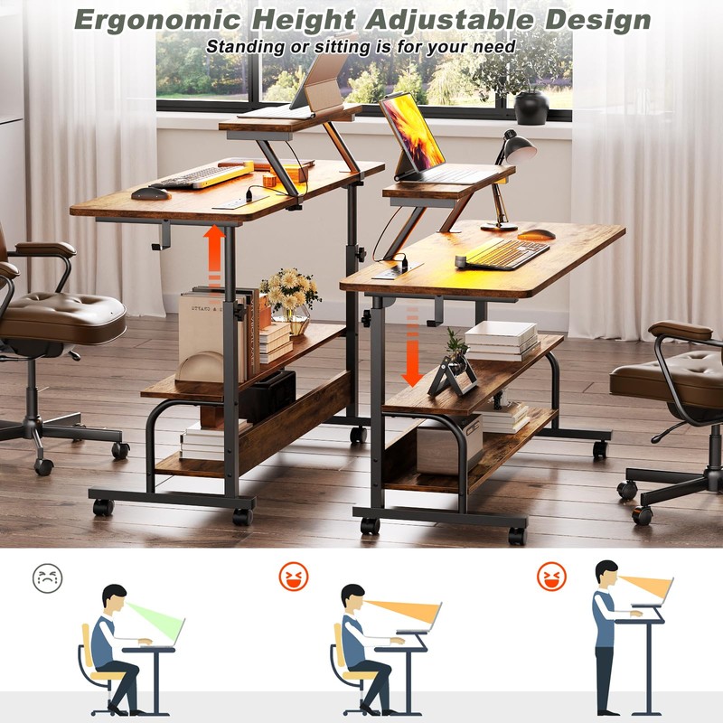 Height Adjustable Standing Desk with Power Outlets and LED Lights - 39" Manual Stand Up Desk with Monitor Stand and Storage Shelves Small Mobile Rolling Computer Desk Portable Laptop Table, Rustic
