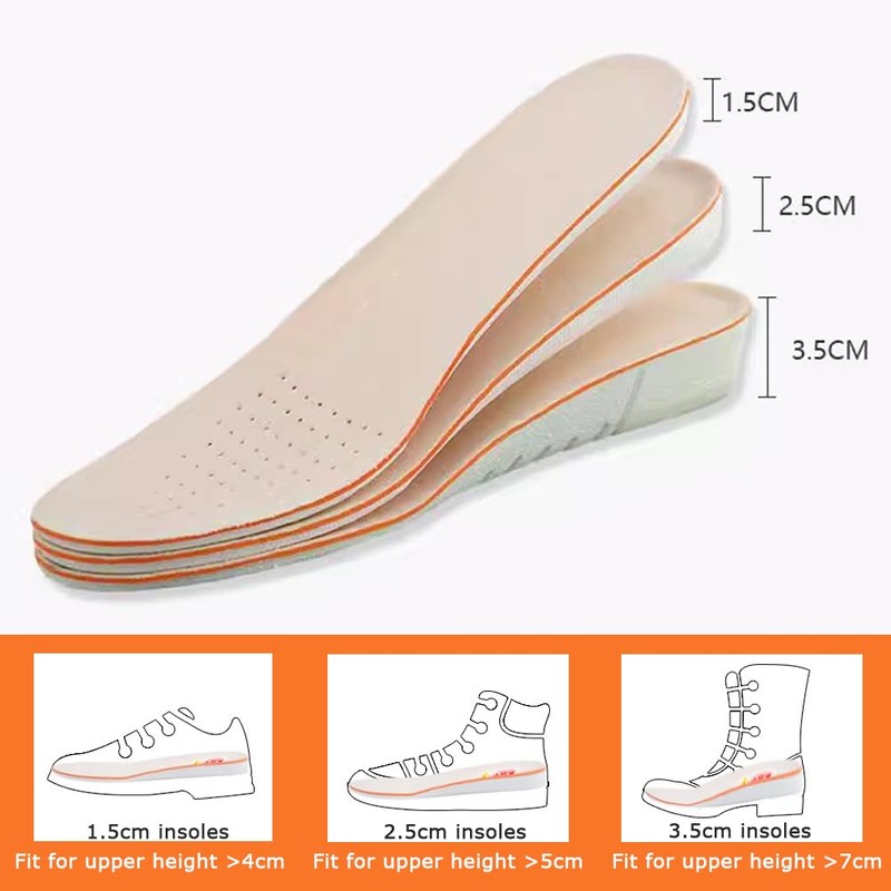 • RAISE HEIGHT This insole comes in two sizes: Small (EU 35-40) and Large (EU 41-45). There are 3 different heights: 1.5 cm, 2.5 cm and 3.5 cm. Depending on the foot size and shoe type, you can choose the most suitable size or height.