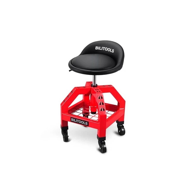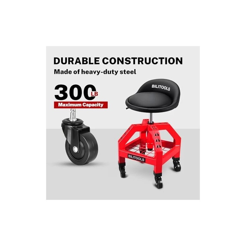 Heavy-Duty Garage Stool for Mechanics:Crafted with a corrosion-resistant, heavy-duty steel frame, this rolling garage stool supports up to 300 lbs. The robust construction makes it ideal for professional mechanics and anyone needing a reliable shop stool.