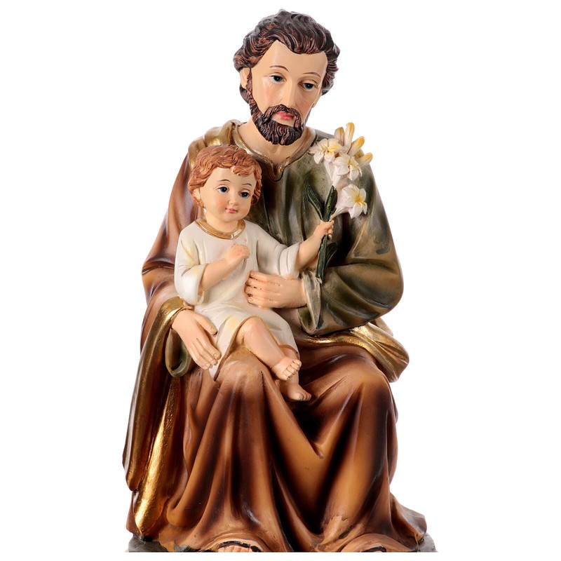Sitzender Heiliger Josef mit dem Jesuskind und einer Lilie, Material: farbig gefasstes Resin, Höhe: 21,4 cm, Sockelmasse: 12x9,5 cm. Der heilige Josef ist auf einem goldenen Sockel dargestellt. Auf der Vorderseite ist der Sockel mit einer Plakette versehen, die mit den Namen des Heiligen in italienischer Sprache "San Giuseppe" beschriftet ist. Die Figur zeichnet sich durch fein ausgeführte Details aus. Gewicht: 0.60 g - Produkt-Grösse: Tiefe: 10 cm|Höhe: 21 cm|Breite: 12 cm - Materials Artikel: Resin - PRODUKTCODE: ST011561