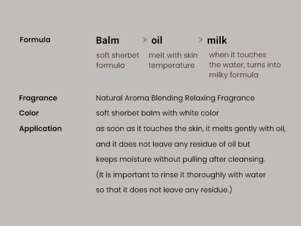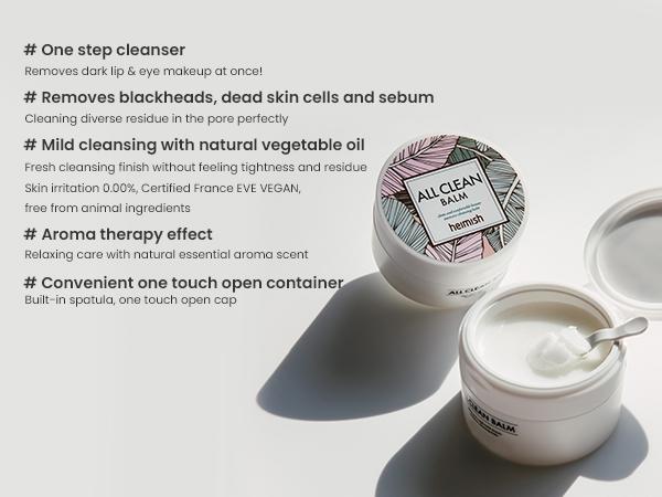 A gentle cleansing balm that removes dry skin, sebum, and blackheads. The reviews say the product clears off sebum in pores, effectively removes makeup, and is less irritating to the skin and the eyes. An all-in-one cleansing balm for heavy makeup, sebum, and blackheads. Certified by EVE VEGAN of France, well known for its rigorous procedures and its exclusive Factory evaluation. Offers a powerful cleansing effect and leaves the skin hydrated and fresh without makeup residue. The sherbet texture softly melts into oil that removes impurities in pores as well as heavy lip and eye makeups. No additional cleansing product required. The Primary Irritation Index of 0.00, cruelty-free, no animal-derived ingredients, and no artificial scent and coloring. Works well for sensitive and tender skin. As the balm texture comes into contact with water, it emulsifies, melts into oil, and removes makeup and dirt in a single step. The balm texture dissolves into oil as it’s rolled, and removes sebum, dead cells, blackheads as well as tiny impurities in pores. Relaxes your stressed body and mind in everyday life, and energizes the tired skin. No need to twist the cap to open or close. The cap opens with a single touch. Keep the product clean by using an included spatula. A blend of aromatic scents that relaxes your body and mind. A soft sherbet-type balm. The balm instantly starts to turn into oil on the skin. The oil is completely washed away after cleansing, while delivering a hydrating finish. The sherbet formula transforms into oil on the skin, and turns into milky white as water is added. The product, comprising 10 types of herb oil, has a relaxing care with natural essential aroma scent that uplifts your mood.