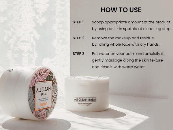 Step 1. To cleanse your face, scoop out a reasonable amount with the included spatula. Step 2. With dry hands, roll the product on the entire face to remove makeup and impurities. Step 3. With slightly wet hands, gently massage your face again to emulsify the balm. Then rinse with lukewarm water.