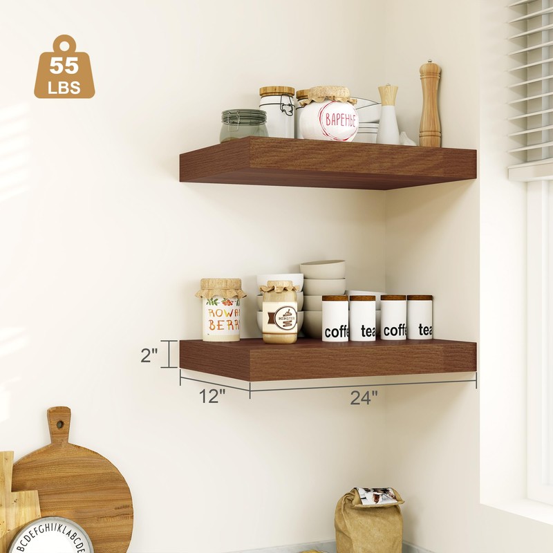 - 12 Inches Deep Floating Shelves :This extra deeper and thicker wall shelves are 24"L x 12"D x 2" H,with a capacity of 55Lbs. Our shelves for wall decor create a variety of storage spaces to organize small items on your desktop or counter.and they blend seamlessly with the rest of other decor and provide a stylish way to organize and display items.