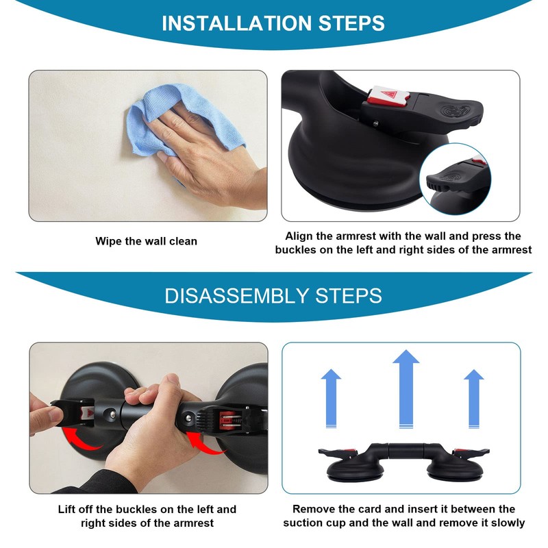 - 【Buying Guide】Prior to purchasing, consider that the grab bars can only be attached to flat, non-porous, and rigid surfaces that are steam-tight, clean, dry, and free from oil/grease. The mobile handles support natural movement, making them ideal for standing up. If installed on tiles, make sure the single tile is larger than 5"*5" and the suction cups avoid touching grout lines.