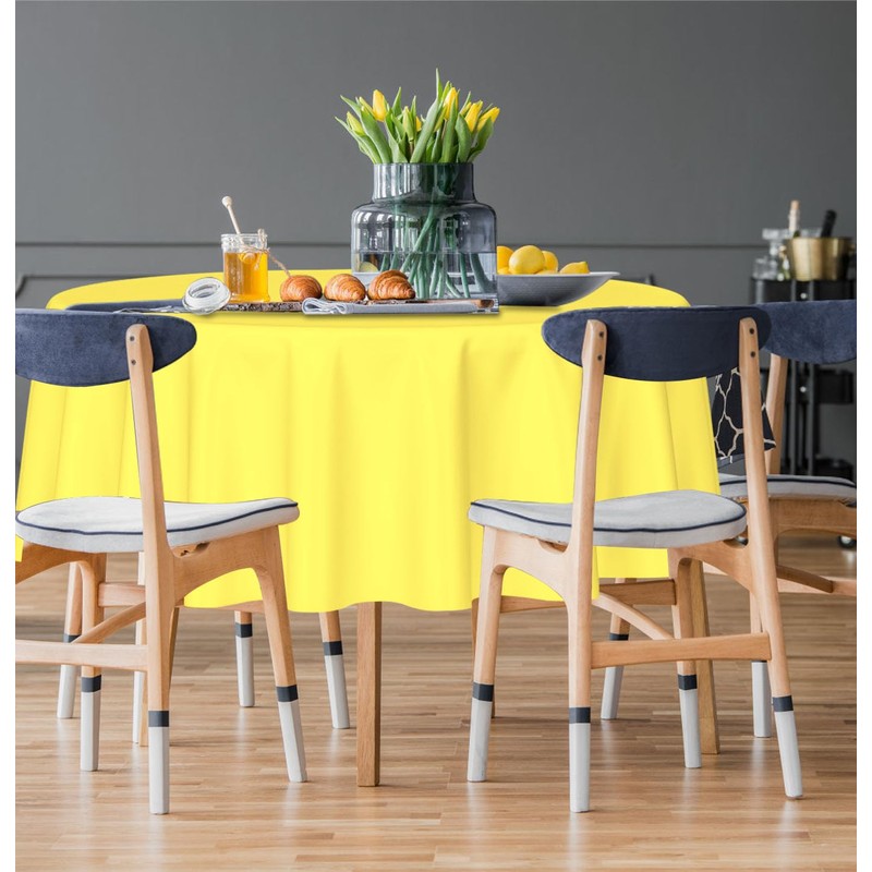- PLASTIC YELLOW TABLECLOTH: Solid color round disposable tablecloth is simple but advanced, and it can be used in any theme party. You can enjoy the joy of the party after using disposable plastic tablecloth, just roll them up and dispose of them after the party