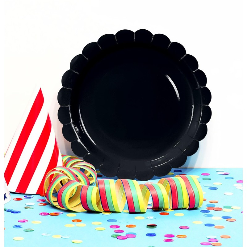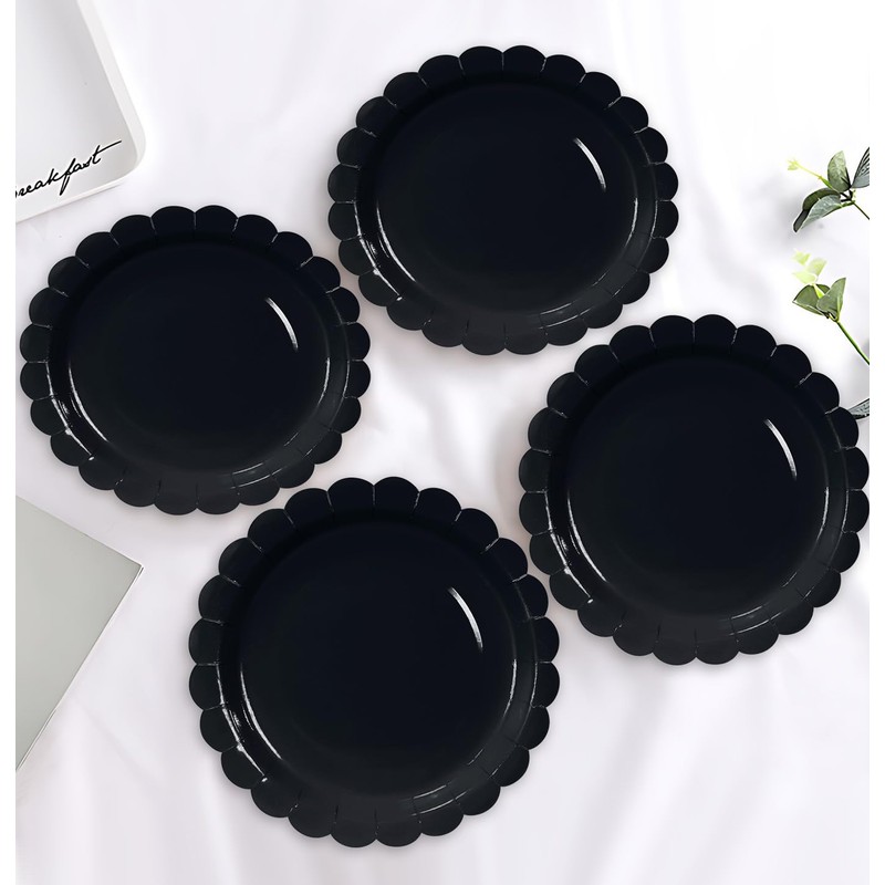 - Disposable plates for party: Black dessert plates disposable can be thrown away directly after use, saving you more time and energy so that you can enjoy the fun of the holiday party. Black scalloped paper plates are a practical table decoration