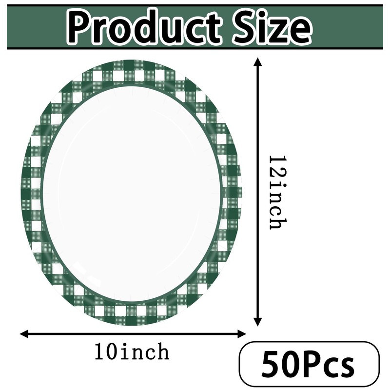 - Oval green and white plates: You will get 50 pieces 10 x 12 inch oval green gingham paper plates, which are made of high-quality materials that are not easy to break, you can place food, dessert or other items on the oval disposable green gingham plates