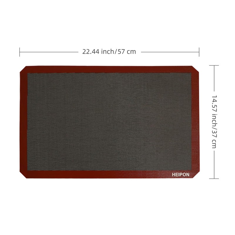 - The size of the baking mat is 22.44"L*14.57"W.The baking mat can be adjusted to fit your baking pan. This baking mat is a food grade silicone baking mat that can be used in ovens up to 480 ℉.It is suitable for ovens,microwaves and refrigerators.But it's not metal,do not bake over open flames.