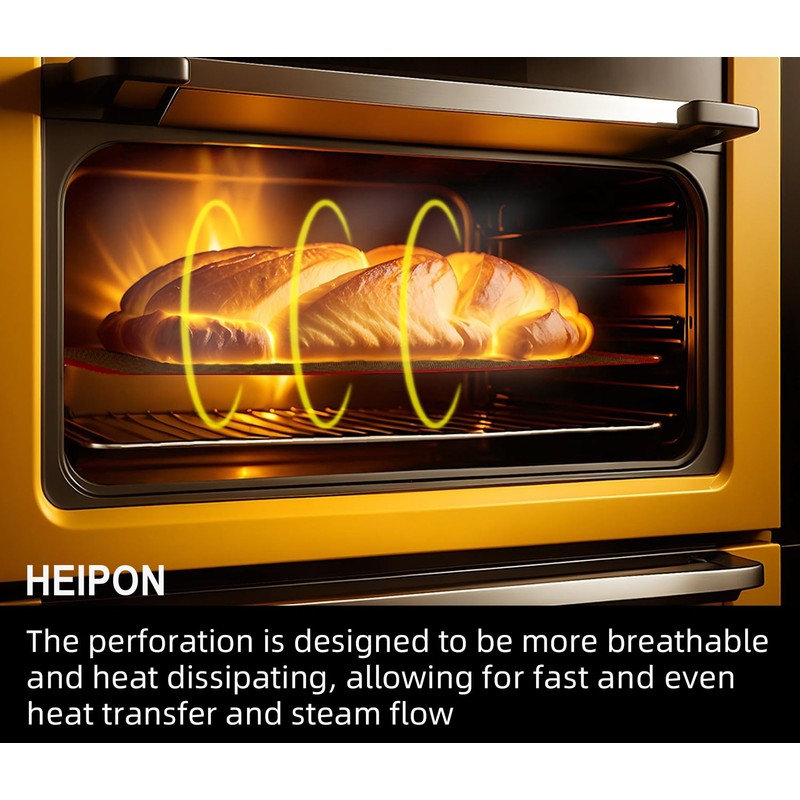 - Perforated silicone baking mat:Silicone baking mat is made from food grade silicone wrapped in fiberglass fabric.Can be reused.The Perforated design is better for ventilation and heat dissipation.Rapid and uniform heat transfer and steam transfer.