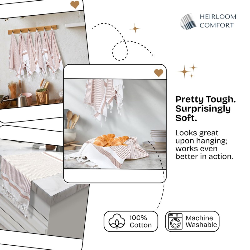 HEIRLOOM COMFORT Brown Turkish Kitchen Towels 16x26 Inch, 12 Pack, 100% Cotton, Ultra Absorbent, Soft, Fast Dry, Machine Washable, Dish Towel with Tassels for Drying Dishes, Cleaning, Everyday Use