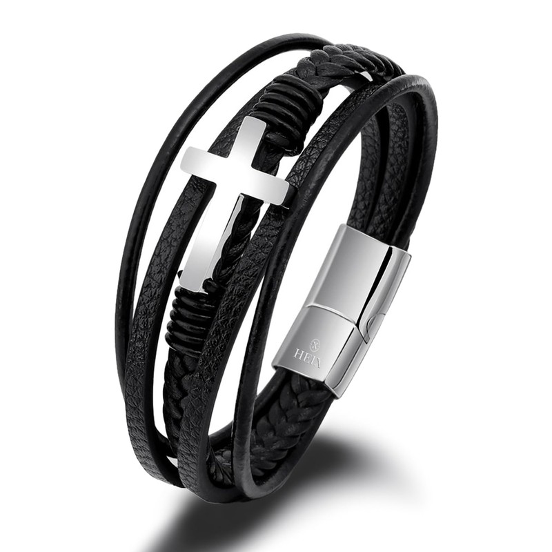 HEIX Mens Multilayer Braised black Leather Glossy Cross Bracelet Magnetic Stainless Steel Clasp Easter Christian Baptist Gift Idea for Men & Boys Jewelry (Silver, 21)