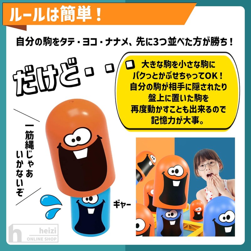 Easy rules. If you put 3 of your own pieces vertically / horizontally / Naname (vertically, horizontal, and first, you win! However, this evolved game is okay to put large pieces into small pieces. Memory is important as your opponent can be hidden or moved again on the board.