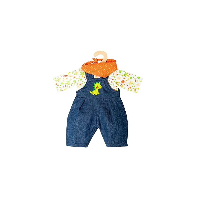 - The stylish doll outfit in Dino design consists of denim dungarees with dinosaur appliqué, a shirt with all-over print and an orange scarf with white dots. The item comes on a practical wooden hanger