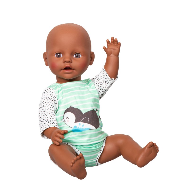 - Doll swimming outfit in gender-neutral penguin polka dot design consisting of a long-sleeved top with penguin motif and a bottom. The item comes on a wooden hanger