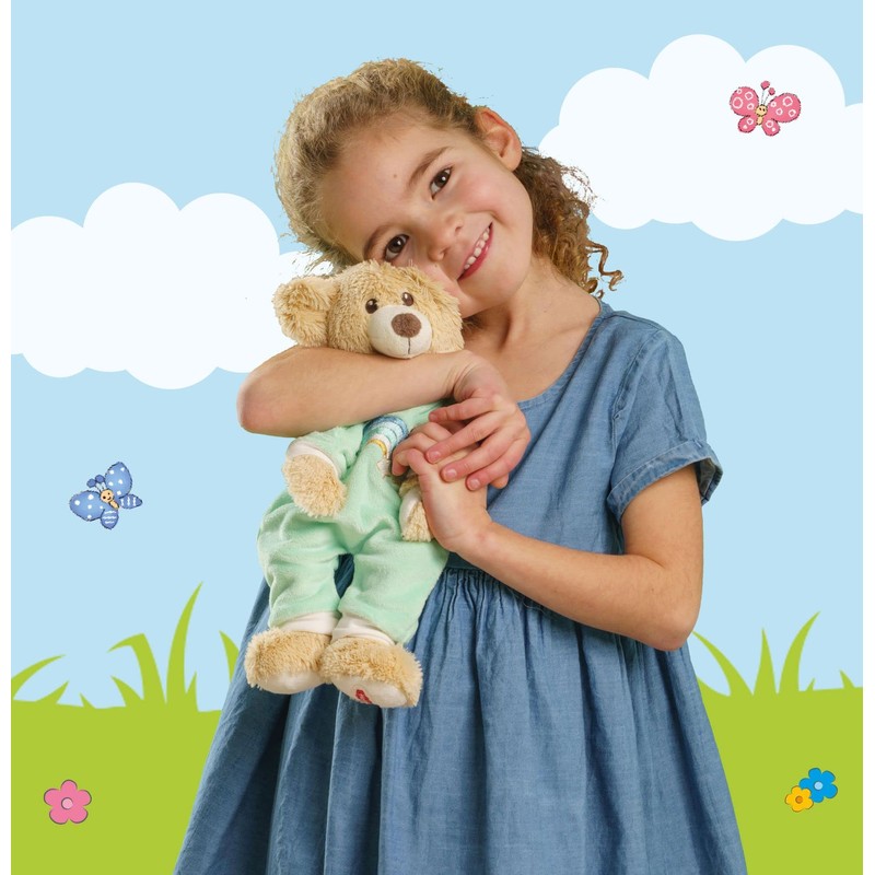- Teddy Dreamy has black button eyes and wears a mint-coloured, fluffy romper made of soft velour with beautiful rainbow embroidery