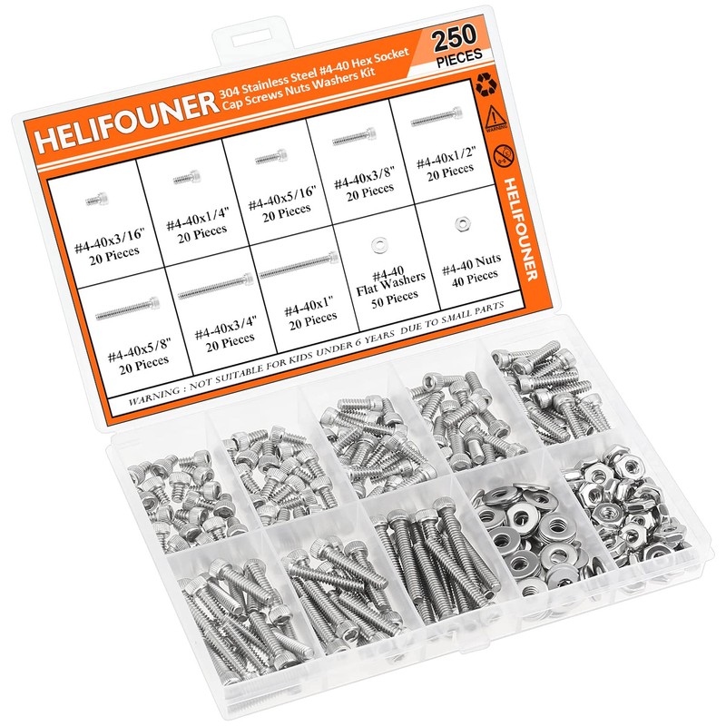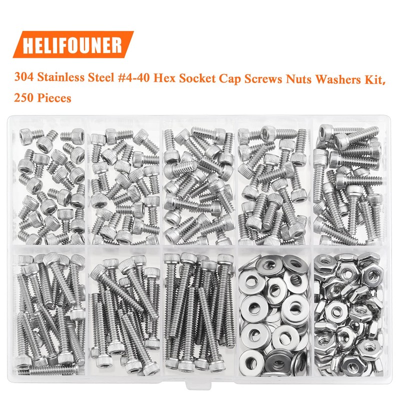 HELIFOUNER 250 Pieces #4-40 x 3/16" 1/4" 5/16" 3/8" 1/2" 5/8" 3/4" 1", Hex Socket Head Cap Screws Bolts Washers Nuts Kit, Coarse Thread, Fully Machine Threaded, 304 Stainless Steel