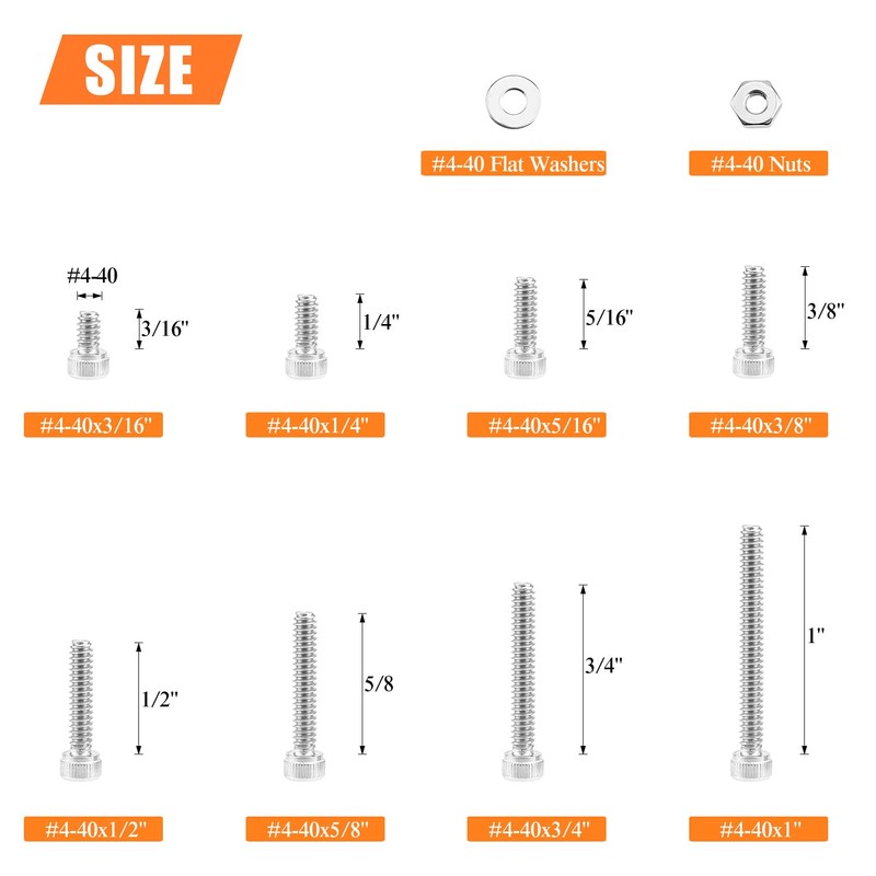 • 【Sizes】#4-40 x 3/16" 1/4" 5/16" 3/8" 1/2" 5/8" 3/4" 1" hex socket head cap screws with matching hex nuts and flat washers, total 10 sizes, different sizes can meet your different needs.