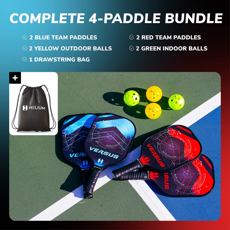 - Everything You Need to Get Started: Our pickleball paddle set has everything you need to play doubles with friends or family. This four player set includes two blue and two red paddles. These paddles denote competition and embody the “Versus” concept. Anyone can pick up our paddles & have fun & competitive games.