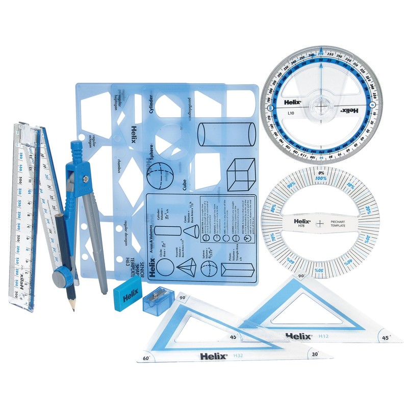 - The Helix Maths Achiever set contains a patented 30cm folding ruler, angle measure, pie chart template, sharpener with anti tamper screws, eraser, 2 shape templates, self centring compass with 9cm pencil and safety point all of which is presented in a blue case.