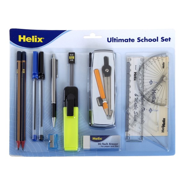 - INCLUDES: 2 HB pencils 2 Ballpoint Pens, 1 Black 1 Blue Mechanical 0.5 Pencil Lead Refils Self Centring Compass in a case with a pencil 180 Degree Protractor 15cm Ruler 2 Set Squares 45 + 60 degrees Large Sleeved Eraser Sharpener Yellow Highlighter Helix Timetable