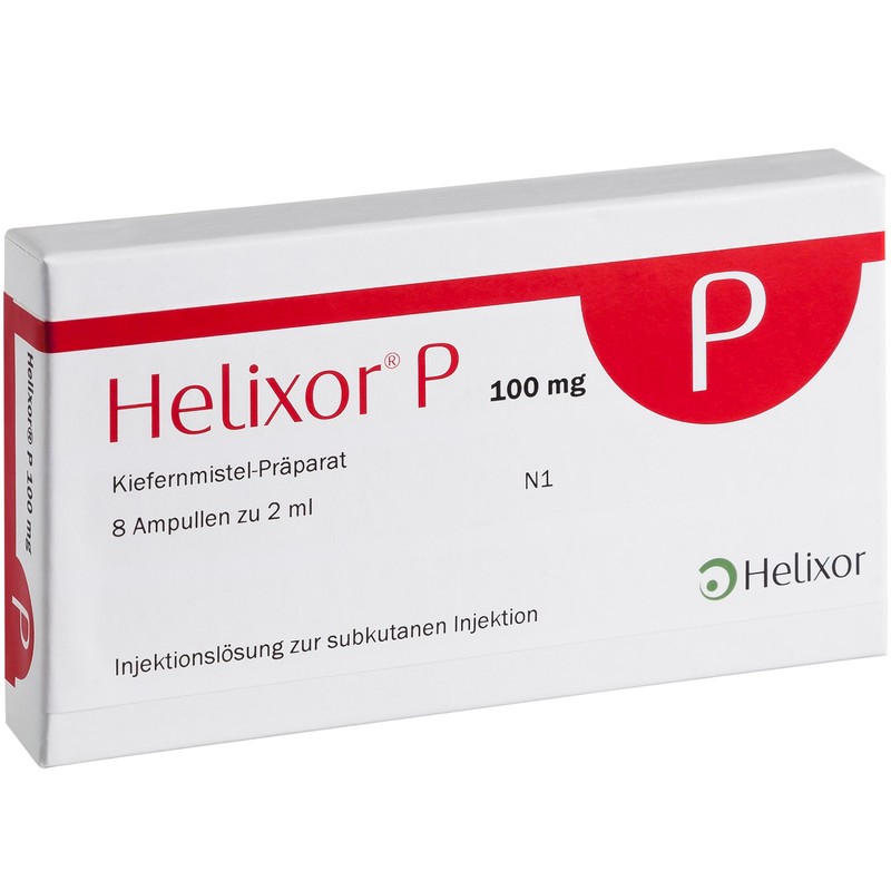 - Helixor P 100 mg, 8 Ampullen: 1 ml Injektionslösung (1 Ampulle) enthält als Wirkstoff den Auszug aus 100 mg frischem Kiefernmistelkraut. Sonstige Bestandteile sind: Wasser für Injektionszwecke.