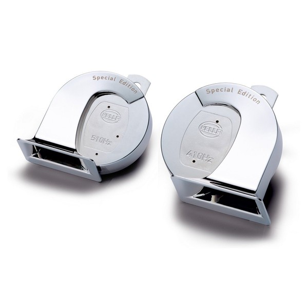 - Application: UNIVERSAL; Special Chrome Edition - Kit includes: 1 high-tone 510Hz horn, 1 low-tone 410Hz horn (Chromed ABS plastic housing and galvanized metal bracket)