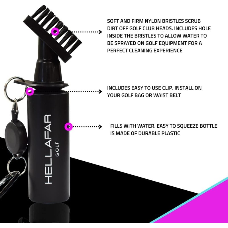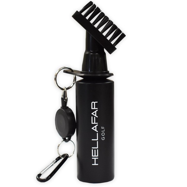 HELLAFAR GOLF Premium Golf Club Water Brush Groove Cleaner with Retractable Clip and Nylon Bristles - Holds 5 Ounces of Water - Golf Accessories for Men, Best Golf Gifts for Men