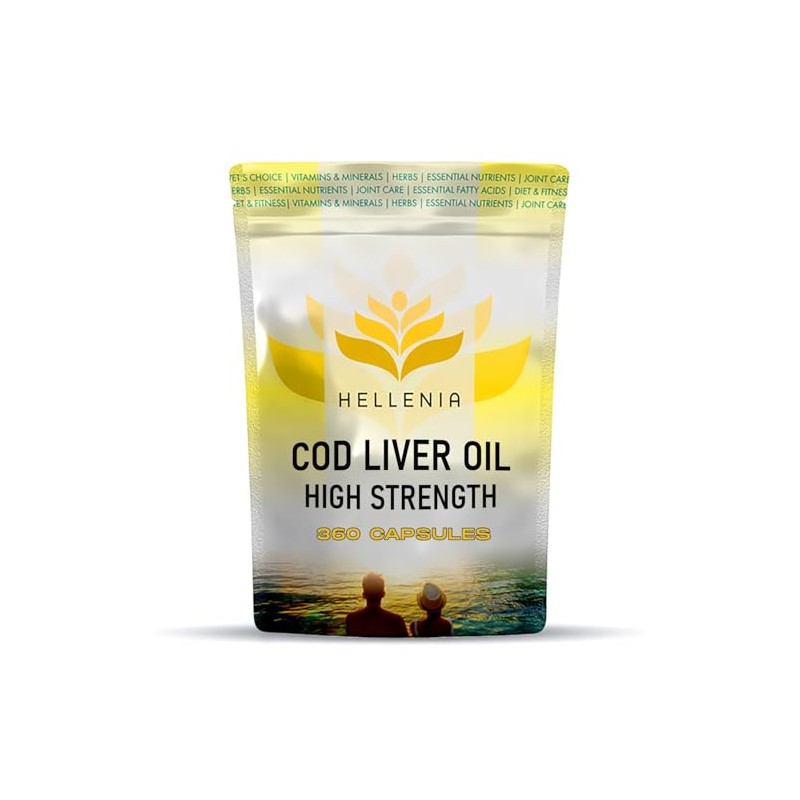 Hellenia Cod Liver Oil Capsules High Strength 1000mg | 360 Fish Oil Capsules UK Made - 1 Year Supply | Rich Source of Omega 3 Essential Fatty Acids | High EPA DHA | Gluten Free - Made in The UK for Hellenia