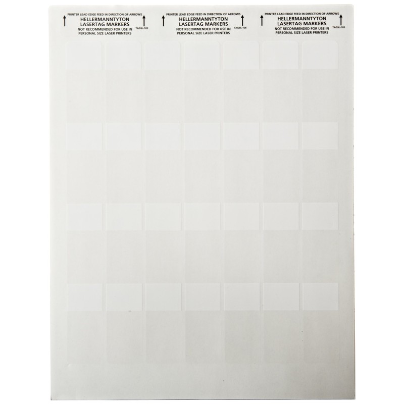 This HellermannTyton TAG9L-105 laser printable polyester label is 2.25" high and 1.0" wide and has 28 labels to a letter-size sheet. Each label includes a white background printable area and a 0.75" high clear vinyl tail section of the label to overlay the printed surface for weather resistance. The acrylic adhesive seals permanently at temperatures above 50 degrees F. The polyester label with acrylic adhesive is weather-resistant and has an operating temperature range of -40 to +300 degrees F. This laser printable polyester label complies with Restriction of Hazardous Substances (RoHS) regulations and is suitable for labeling wire or cable in a variety of environments.