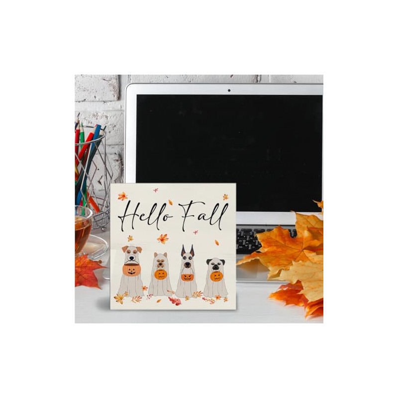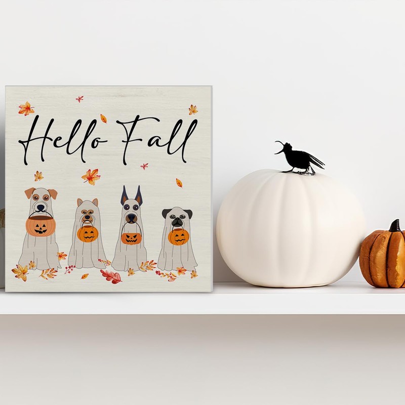 Hello Fall Sign, Ghost Dog Decor, Fall Halloween Pumpkin Wood Block Plaque for Home Office Decorations (5 x 5 Inches)