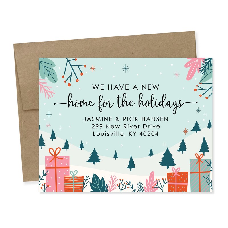- Share your new address in a festive and memorable style with personalized Moving Announcement flat notecards with envelopes featuring a winter holiday scene. The back of the notecard will be blank white, leaving room for a handwritten message if desired.