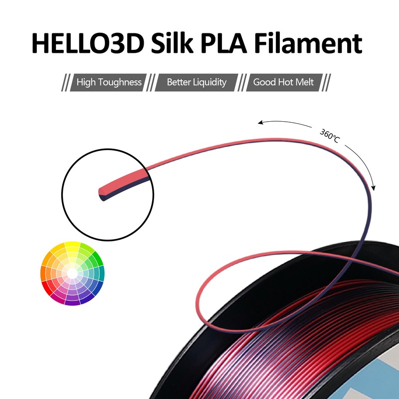 HELLO3D dual color silk filament has amazing silk texture, outstanding silk glossy smooth appearance. Prints finish by our dual color silk PLA will definitely give you an eye-poping result.