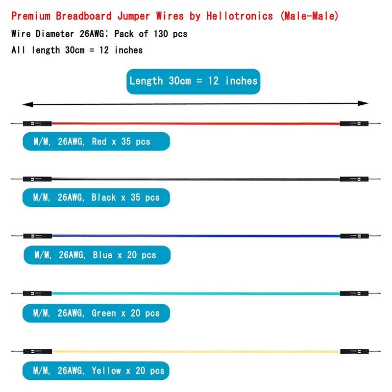 Hellotronics Breadboard Jumper Wires Male to Male, Pack of 130 Pieces More Red And Black M-M Jumpers Wires Cables, Square Head 0.1'' 26AWG 5 Colors (30CM, M/M)