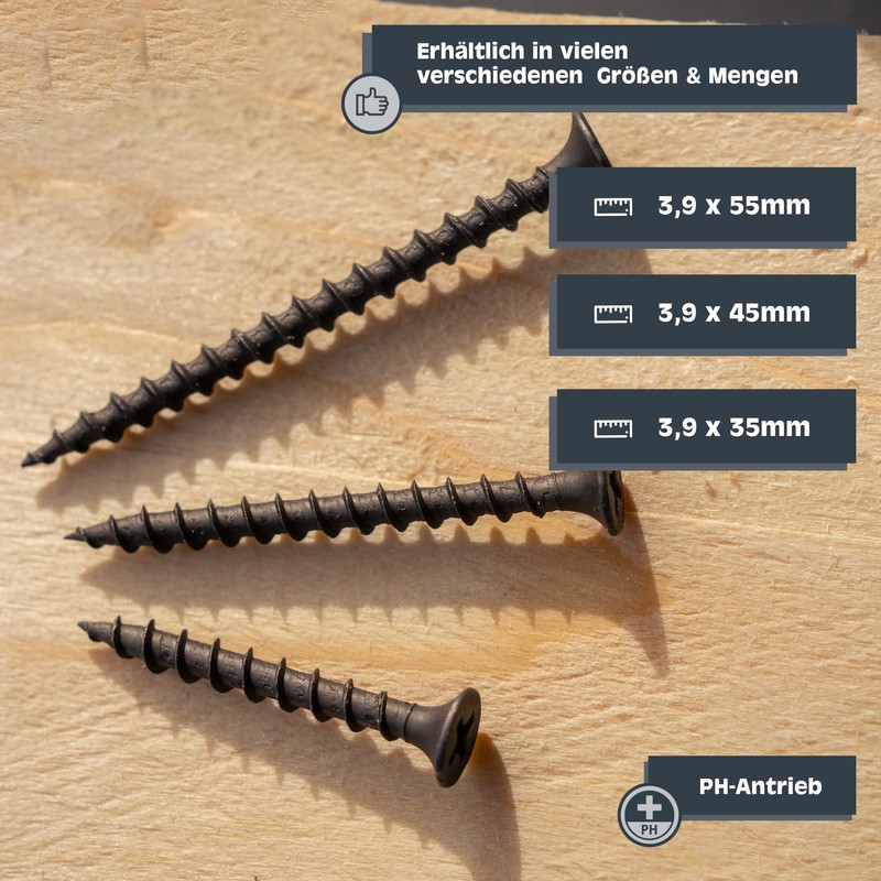 - Phosphatiert: Die schwarze Phosphatierung der Schrauben bietet Korrosionsschutz bei kurzzeitiger Feuchtebeanspruchung, wie beim Bau oder dem Transport; Ideal zur Anhaftung von Spachtelmasse