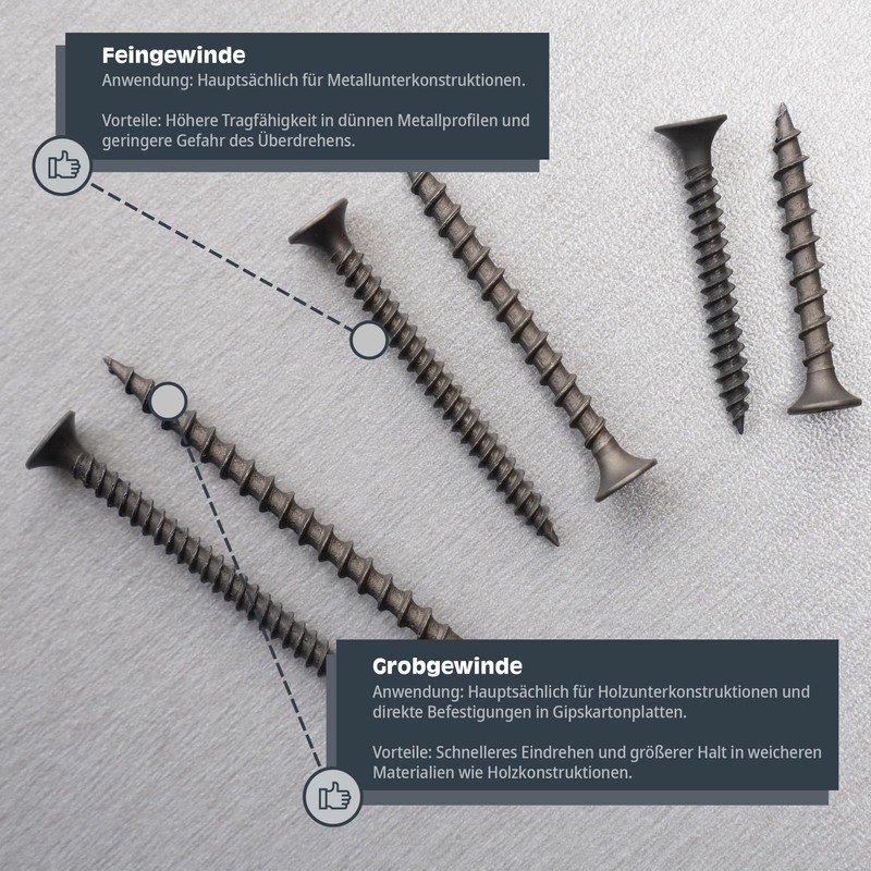 - Einsatz: Schnellbauschrauben eignen sich besonders gut zur Fixierung von Gipskartonplatten auf eine Unterkonstruktion aus Metall oder aus Holz