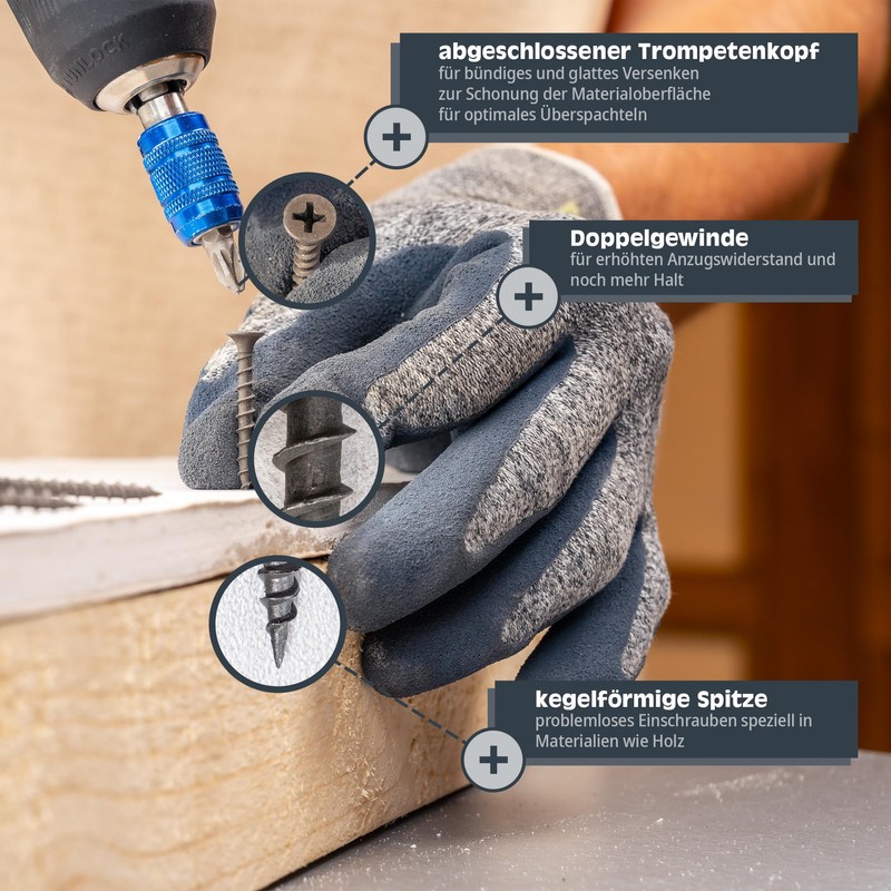 - Kein Vorbohren: Die scharfkantige Spitze ermöglicht es, die Schraube ganz einfach, ohne zeitaufwendiges Vorbohren, einzuschrauben