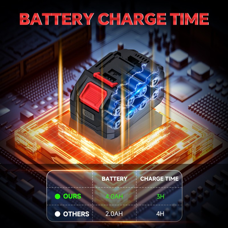- 2 x 4.0Ah Batteries – Keep Your Cordless Impact Wrench Running All Day: Comes with two 4.0Ah high-capacity batteries to power your cordless impact wrench without downtime. Swap batteries quickly for extended use, whether tackling back-to-back tire changes or equipment maintenance—no need to pause for charging.