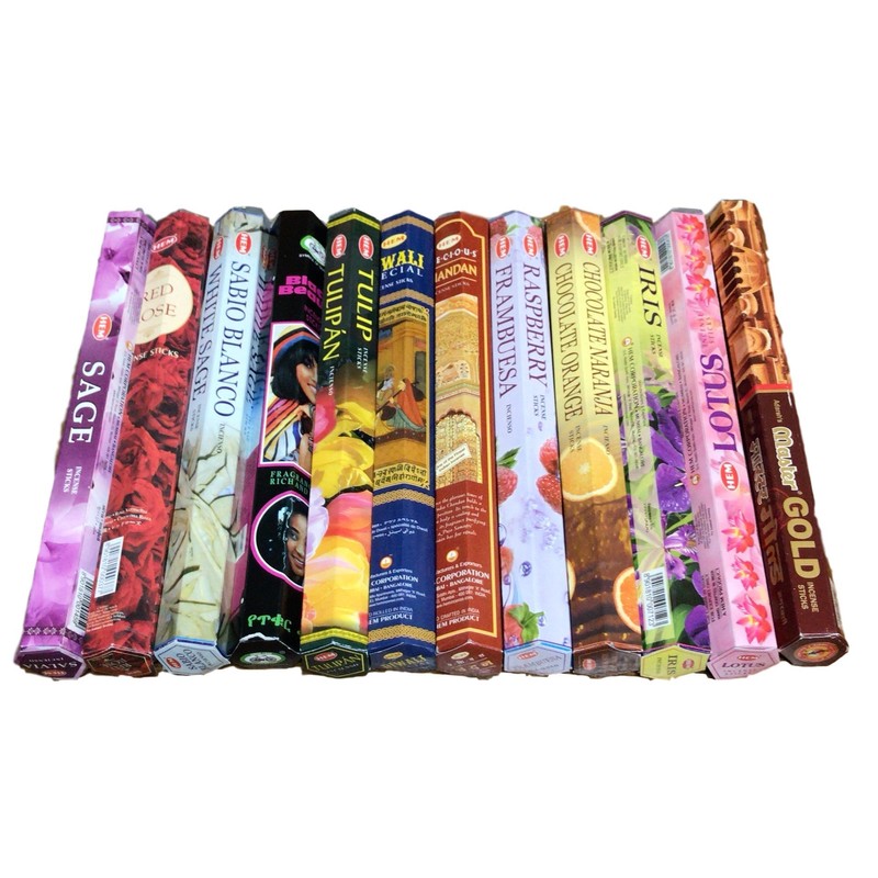 - A variety set of 12 assorted Indian incense sticks from the popular incense brand HEM company.